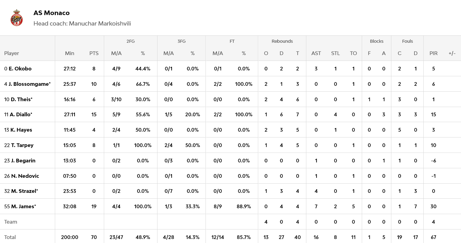 Ξεχώρισαν: Μιλουτίνοβ, με 13 πόντους και 10 ριμπάουντ, Τζόσεφ, με 13 πόντους, δύο ριμπάουντ και τέσσερις ασίστ και Φουρνιέ, με 13 πόντους και επτά ασίστ, οδήγησαν τον Ολυμπιακό στην νίκη. Για την Μονακό, ο Τζέιμς έκανε ότι μπορούσε με 19 πόντους και επτά ασίστ.