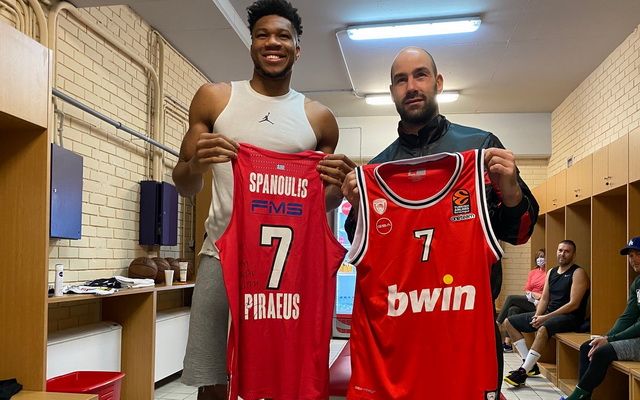 Οι δύο αστέρες είχαν την ευκαιρία να συνομιλήσουν για λίγα λεπτά, με τον Σπανούλη να τηρεί την υπόσχεση του, δίνοντας στον Αντετοκούνμπο την φανέλα που φορούσε την περσινή σεζόν, όταν και αναδείχθηκε πρώτος σκόρερ στην ιστορία της Euroleague, αλλά και την φετινή του φανέλα.