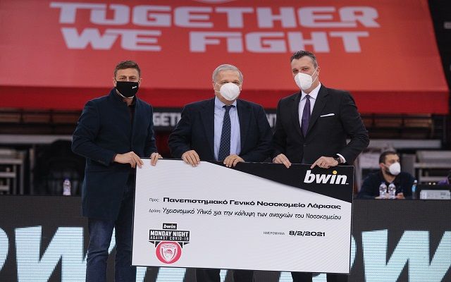 Συγκεκριμένα o Γενικός Διευθυντής. της ΚΑΕ Ολυμπιακός, N.Λεπενιώτης και ο Sponsorship Manager της bwin, Θ.Τζαβιδόπουλος,παρέδωσαν στον Φ.Τριποσκιάδη, διευθυντή της Πανεπιστημιακής καρδιολογικής κλινικής του Πανεπιστημιακού Νοσοκομείου, υγειονομικό υλικό για την κάλυψη των αναγκών του Νοσοκομείου.