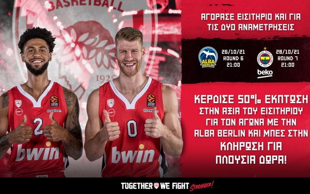 Εξασφάλισε τη θέση σου στους εντός έδρας αγώνες της Ευρωλίγκας κόντρα σε Άλμπα Βερολίνου (26/10/21, 21.00) και Φενέρμπαχτσε (28/10/21, 21.00) και βγες πολλαπλά κερδισμένος!