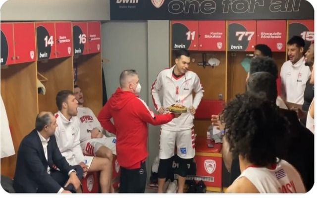 Μετά την εντός έδρας νίκη του Ολυμπιακού επί του Ιωνικού με 109-65, οι άνθρωποι των ερυθρολεύκων έκαναν έκπληξη με μια τούρτα στα αποδυτήρια για τον Κώστα Σλούκα, ο οποίος, το Σάββατο (15/1), έκλεισε τα 32 του χρόνια, με τους προπονητές, τους παίκτες και όλο το επιτελείο να του τραγουδούν τα "χρόνια πολλά".