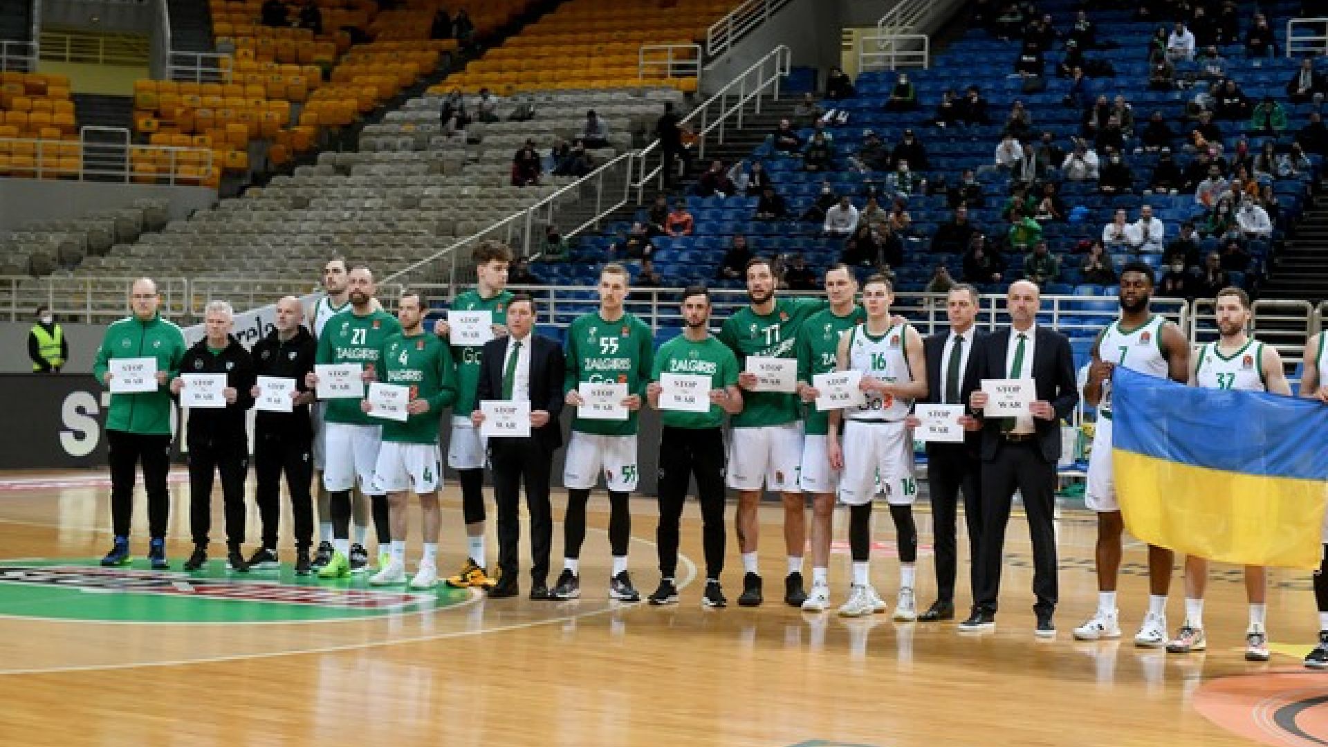 Οι παίκτες της Ζάλγκιρις σήκωσαν την σημαία της Ουκρανίας στο πλαίσιο της παρουσίασης των δύο ομάδων στο παρκέ του ΟΑΚΑ πριν την αναμέτρηση με τον Παναθηναϊκό.