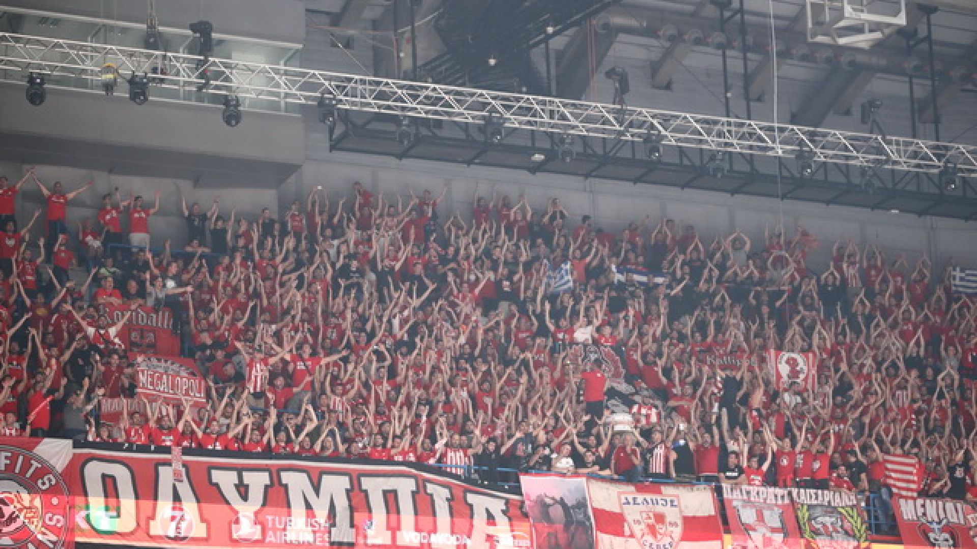 Οι φίλοι του Ολυμπιακού έχουν αρχίσει να γεμίζουν τις εξέδρες της Stark Arena, με την "ερυθρόλευκη" γιορτή να έχει μεταφερθεί, από τις πλατείες και τον περιβάλλοντα χώρο, εντός κλειστού.