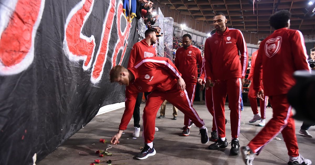 Έτσι, με την είσοδο της ομάδας στο παρκέ, άπαντες κατευθύνθηκαν προς το πέταλο των οργανωμένων και το πανό με την… καταραμένη ημερομηνία, αφήνοντας από ένα λουλούδι.