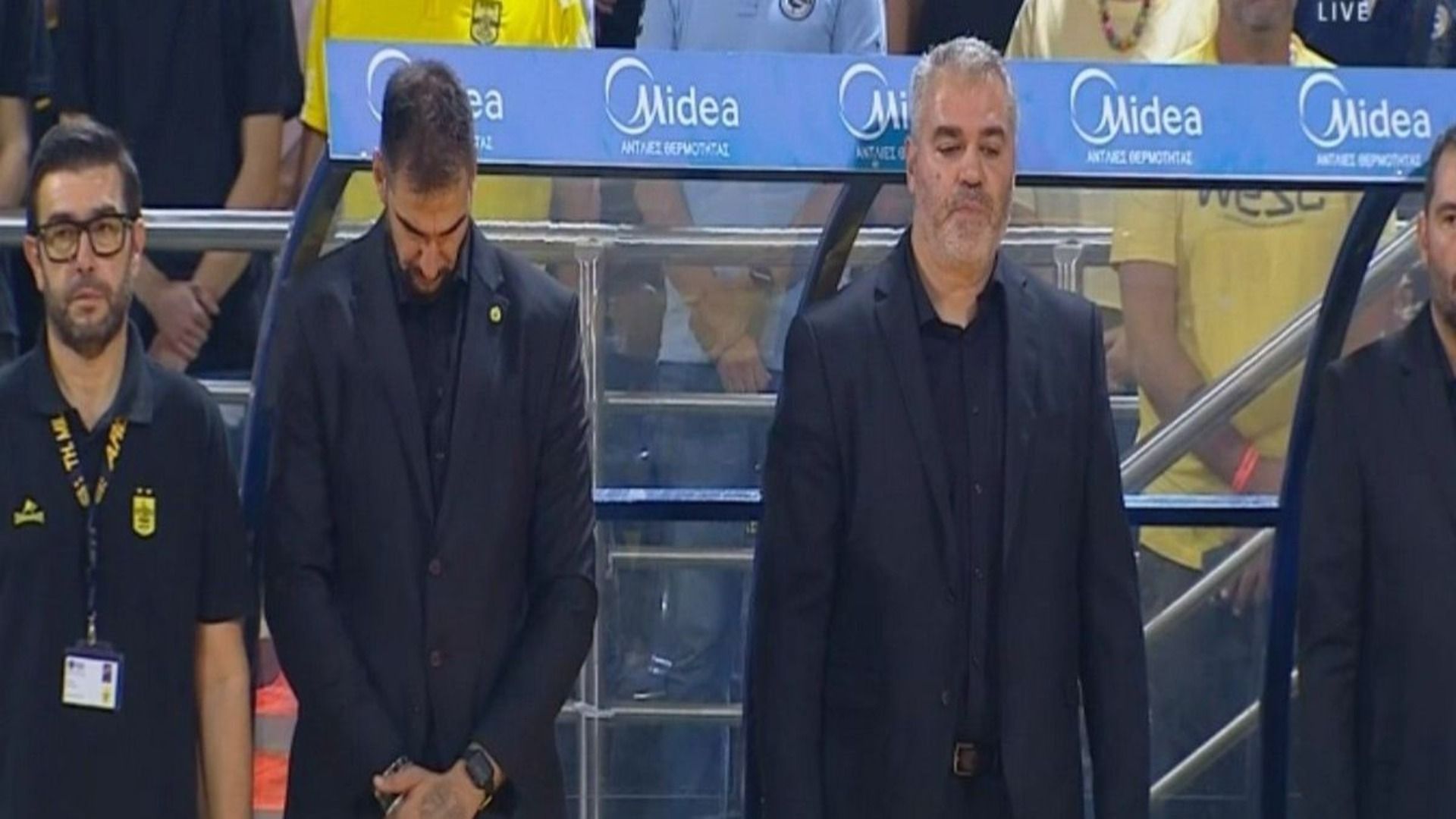 Η κάμερα έδειξε τον Γιώργο Σιγάλα να εμφανίζεται συντετριμμένος στον πάγκο την ώρα της ενός λεπτού σιγή για την απώλεια του αείμνηστου κόουτς, με τον οποίο είχε συνεργαστεί στον Ολυμπιακό στη δεκαετία του 1990.