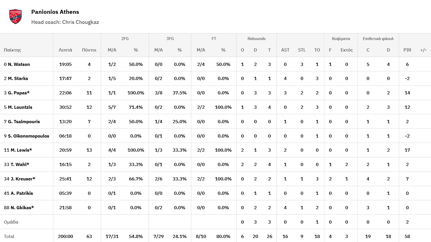 Ξεχώρισαν: Ο Λιούις πέτυχε 13 πόντους για τον Πανιώνιο, που είχε τους Λούντζη και Κρούζερ με 12 έκαστος. Για τους νικητές, 15 πόντους πέτυχε ο Μαγκί.