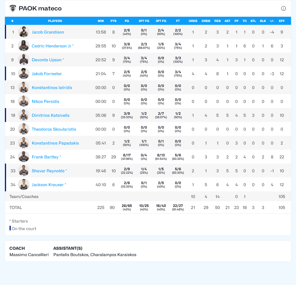 Ξεχώρισαν: Ο Χέντερσον και ο Κρούζερ από τον ΠΑΟΚ είχαν 10 πόντους. Απο την Σολε ξεχώρισαν οι Αγιαγί και Μάλβιν με 17 πόντους έκαστος.