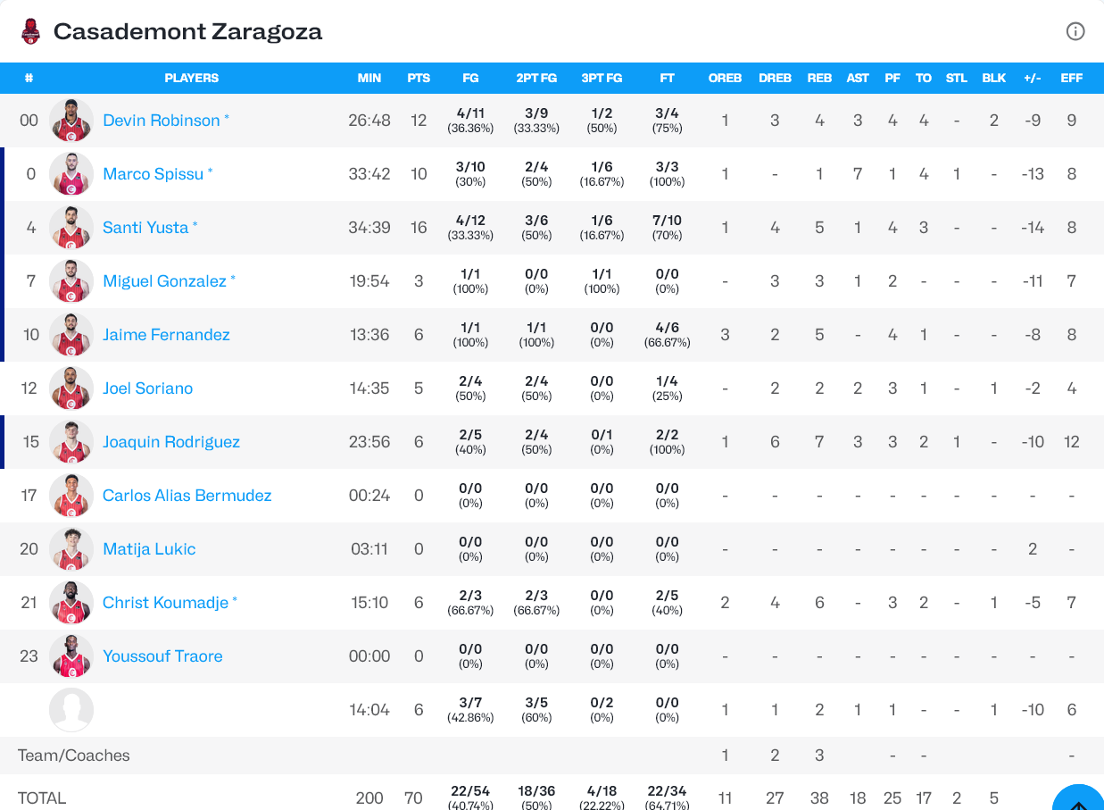 Ξεχώρισαν: Τόρε και Χάρις είχαν 15 και 14 πόντους αντίστοιχα, ενώ για την Σαραγόσα, ο Γιούστα είχε 16 πόντους.