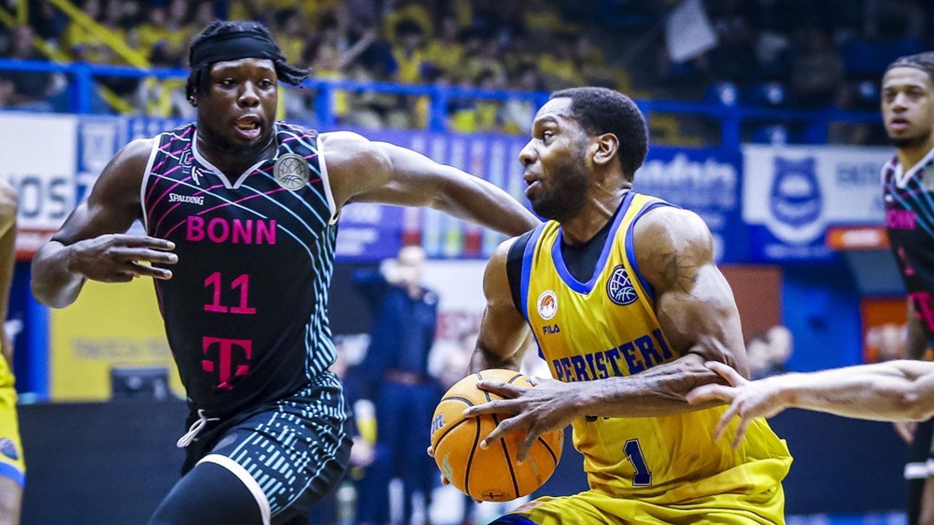 Οι γηπεδούχοι άρχισαν καλύτερα τον αγώνα και προηγήθηκαν με 8-2 με καλάθι του Κιρκγουντ,αλλά το Περιστέρι με επιμέρους σκορ 17-6 προηγήθηκε με 5 (14-19),με την πρώτη περίοδο να λήγει με σκορ 22-24. Στην δεύτερη περίοδο το επιμέρους 15-6 της Βόννης ανέβασε την διαφορά στους 7 (37-30),αλλά η ελληνική ομάδα με δικό της σερί 6-0 έριξε την διαφορά στον πόντο (39-38). Οι δύο ομάδες πήγαν στα αποδυτήρια με το σκορ στο 45-44 με τρίποντο του Σενγκφέλντερ.
