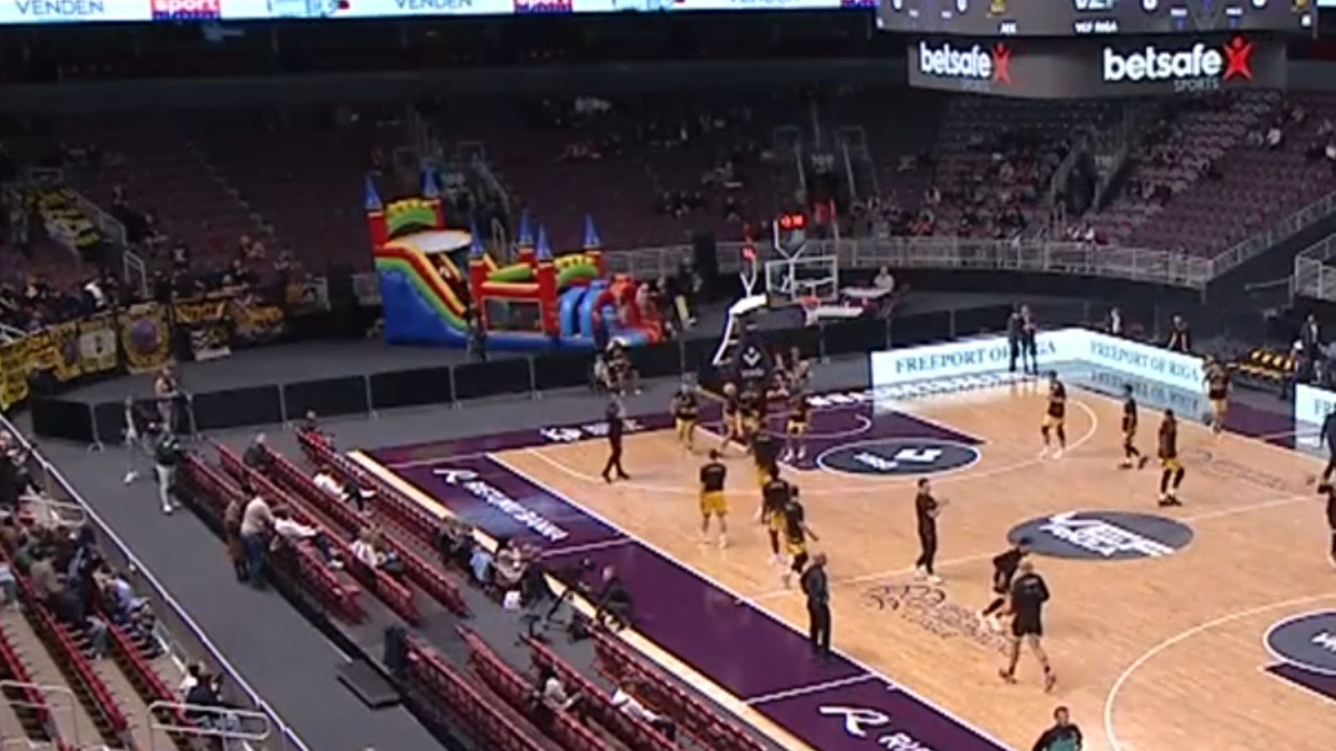 Πρωτοφανής εικόνα στη Λετονία στην αναμέτρηση Ρίγα-ΑΕΚ για το Basketball Champions League, καθώς πίσω από την μία μπασκέτα έχει τοποθετηθεί φουσκωτός παιδότοπος.