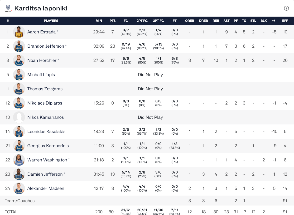 Ξεχώρισαν: Για τους νικητές ο Μπιν με 14 πόντους, ενώ για τους Θεσσαλούς οι Τζέφερσον 23 πόντους και 7 ασσίστ και ο διπλός Χόρχλερ με 17 πόντους και 10 ριμπάουντ.