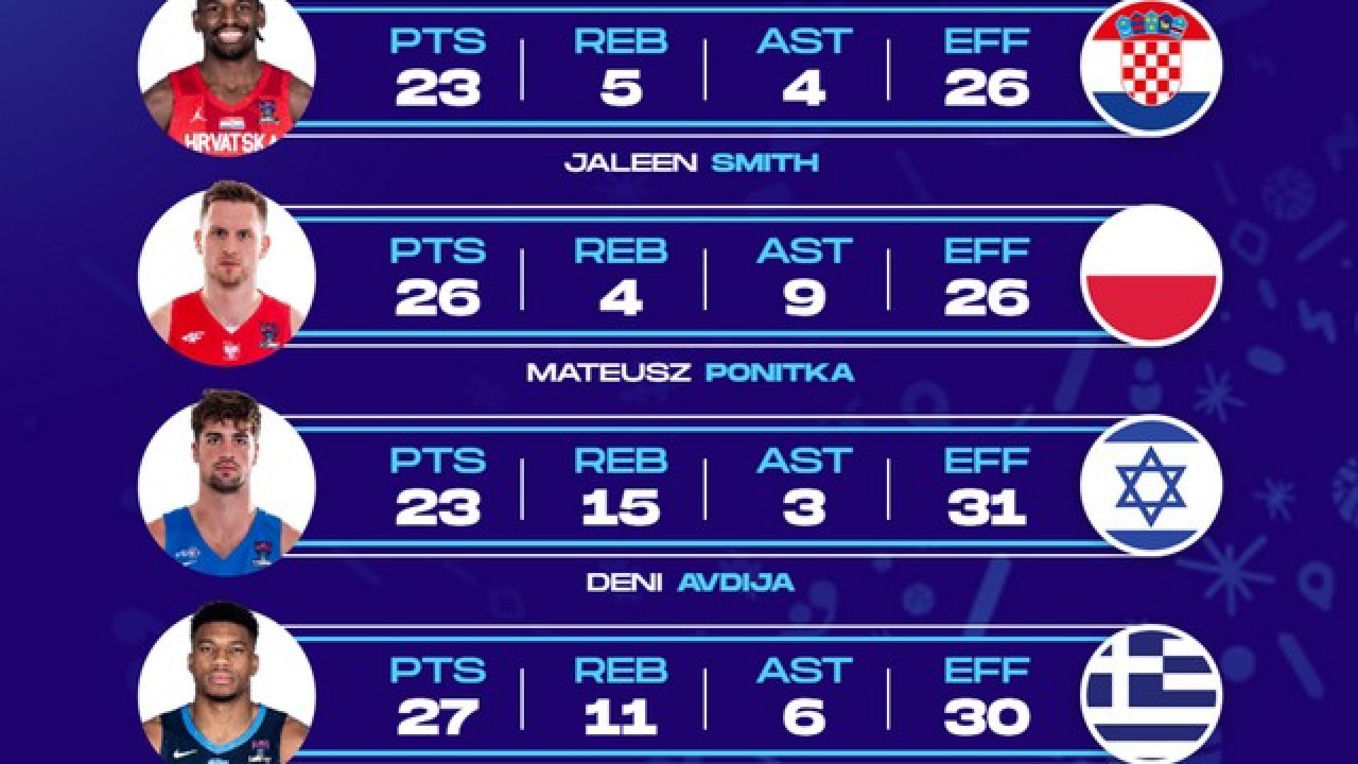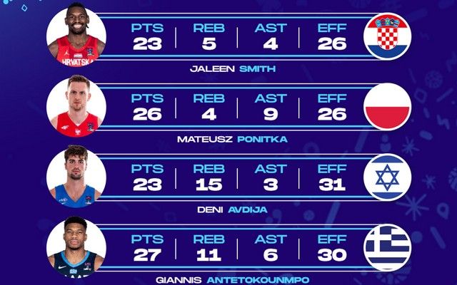 Από τη μεριά των νικητών, ο Ντένι Αβντίγια είχε 23 πόντους, 15 ριμπάουντ, 3 ασίστ και 31 μονάδες στο σύστημα αξιολόγησης, κάνοντας κυριολεκτικά... τα πάντα προκειμένου το Ισραήλ να επικρατήσει της Φινλανδίας με 89-87.