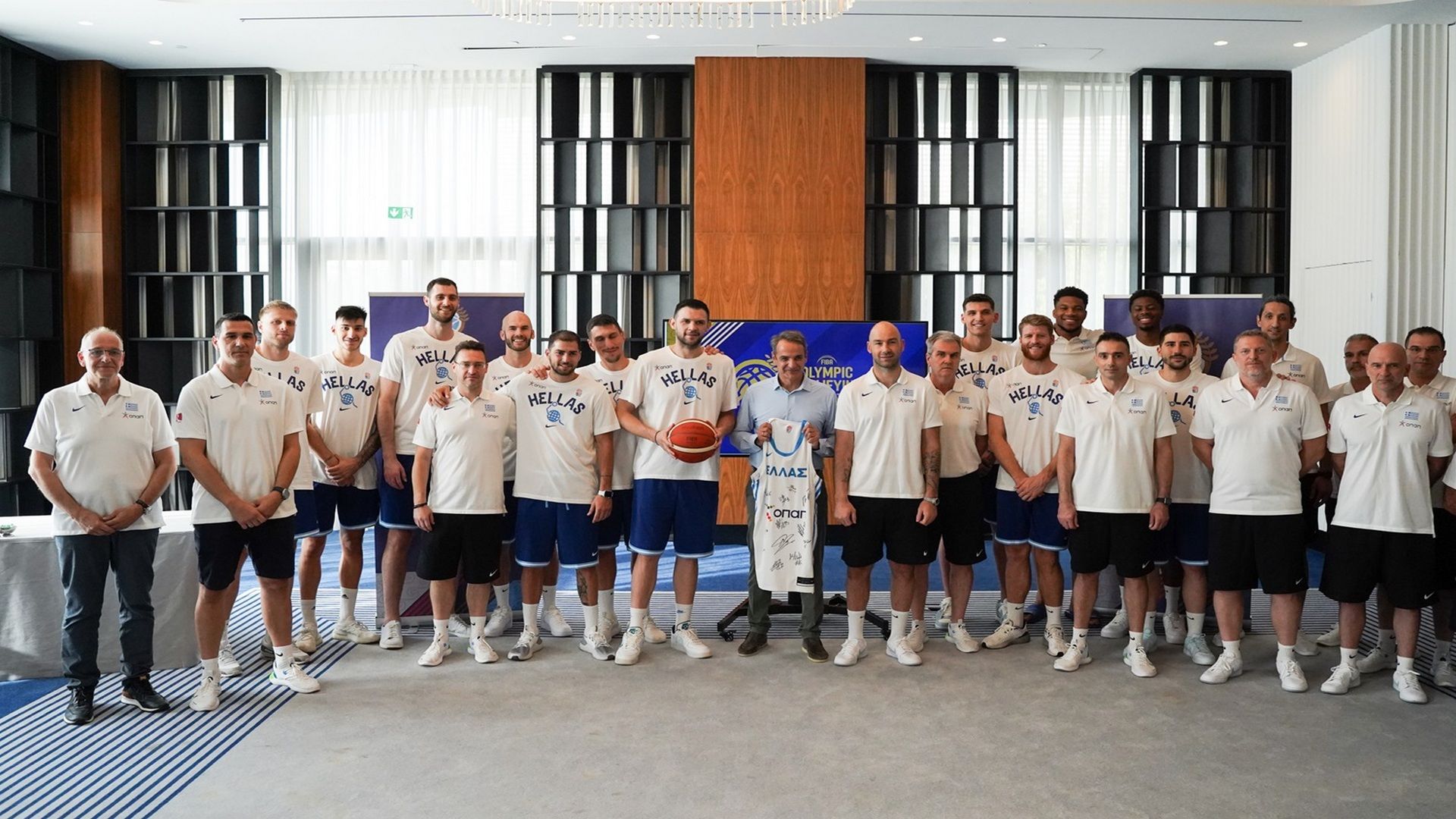 Την υποστήριξή του έδειξε και τις ευχές του έδωσε ο πρωθυπουργός της χώρας και φίλος του μπάσκετ Κυριάκος Μητσοτάκης , το απόγευμα της Δευτέρας (1/7) καθώς βρέθηκε στο ξενοδοχείο της αποστολής της εθνική μας ομάδας.
