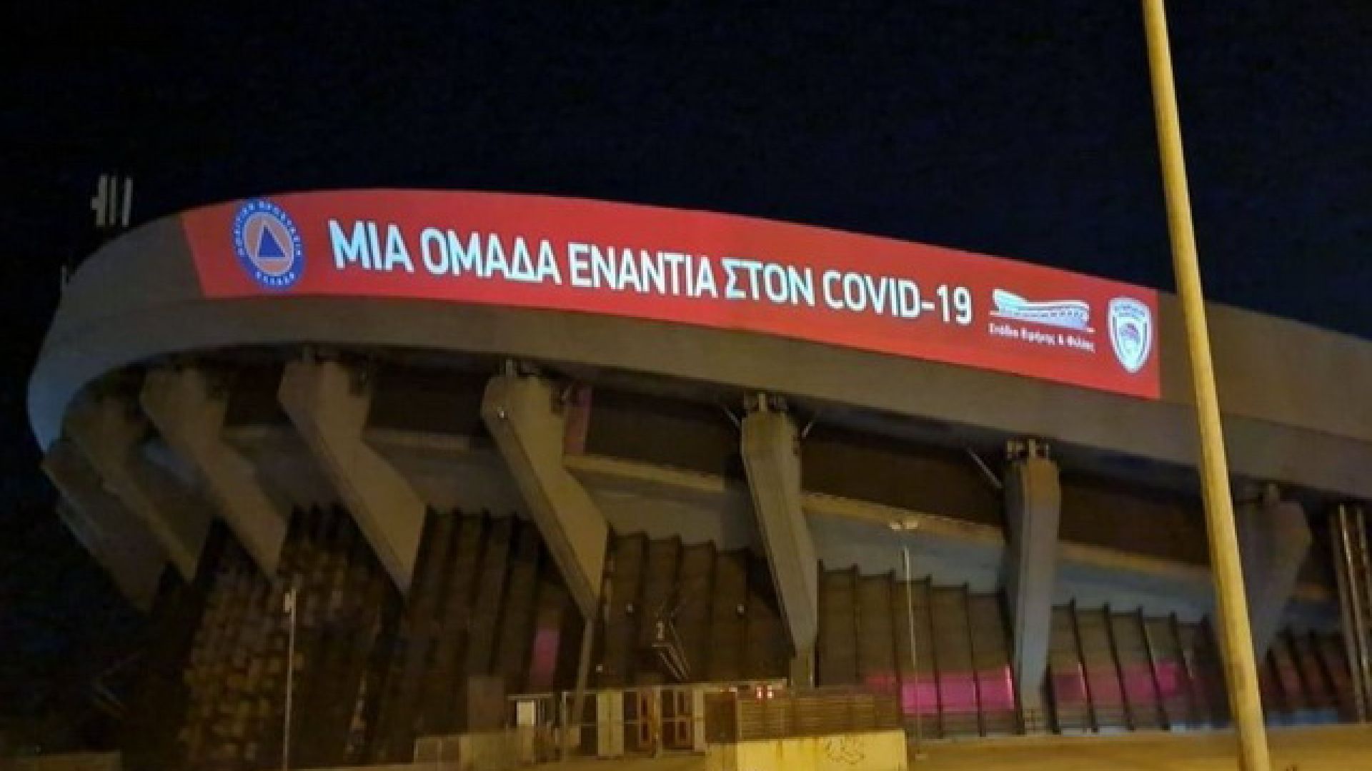 Ηχηρό μήνυμα ενότητας στη μάχη ενάντια στην πανδημία στέλνουν η Γενική Γραμματεία Πολιτικής Προστασίας, το Στάδιο Ειρήνης και Φιλίας και η ΚΑΕ Ολυμπιακός με το σύνθημα «Μια ομάδα ενάντια στον COVID-19».
