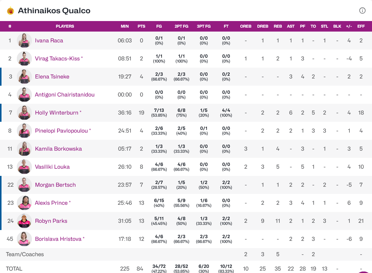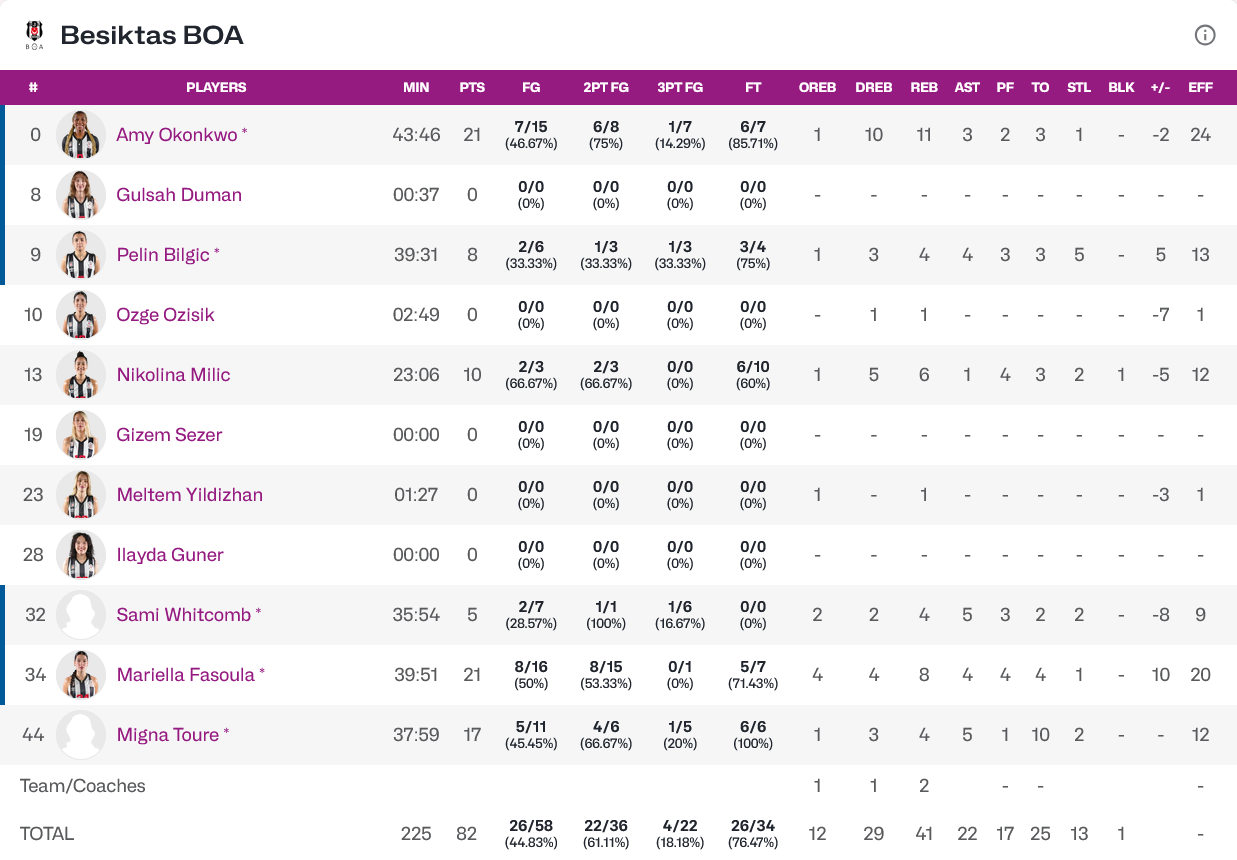 Εξαιρετική η Παρκς με 13 πόντους και 11 ριμπάουντ, όσους σημείωσε και η Πρινς, ενώ η Γουίντερμπερν είχε 19 πόντους. Για την Μπεσίκτας, Φασούλα και Οκόνκουο είχαν από 21 πόντους, με την Ελληνίδα σέντερ να κατεβάζει και οκτώ ριμπάουντ.