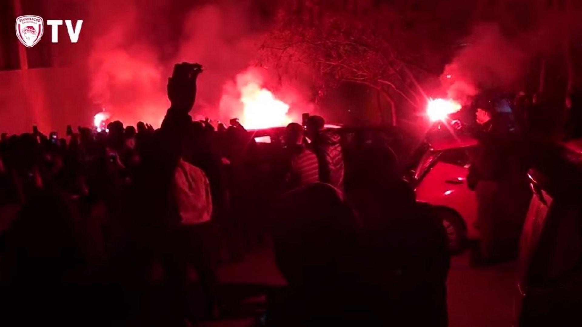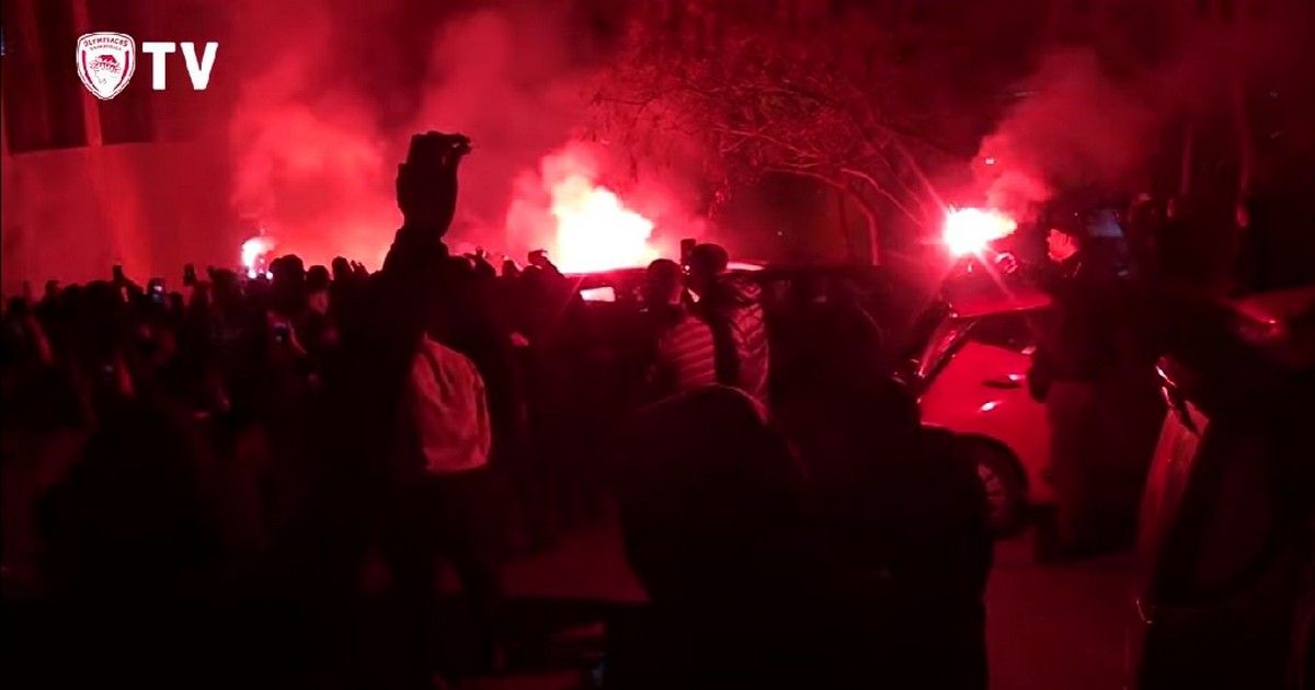 Αποθεωτική υποδοχή επιφύλαξαν οι φίλοι του Ολυμπιακού στους Κυπελλούχους, με τον κόσμο να περιμένει την αποστολή της αγαπημένης του ομάδας στο ξενοδοχείο όπου είχε καταλύσει.