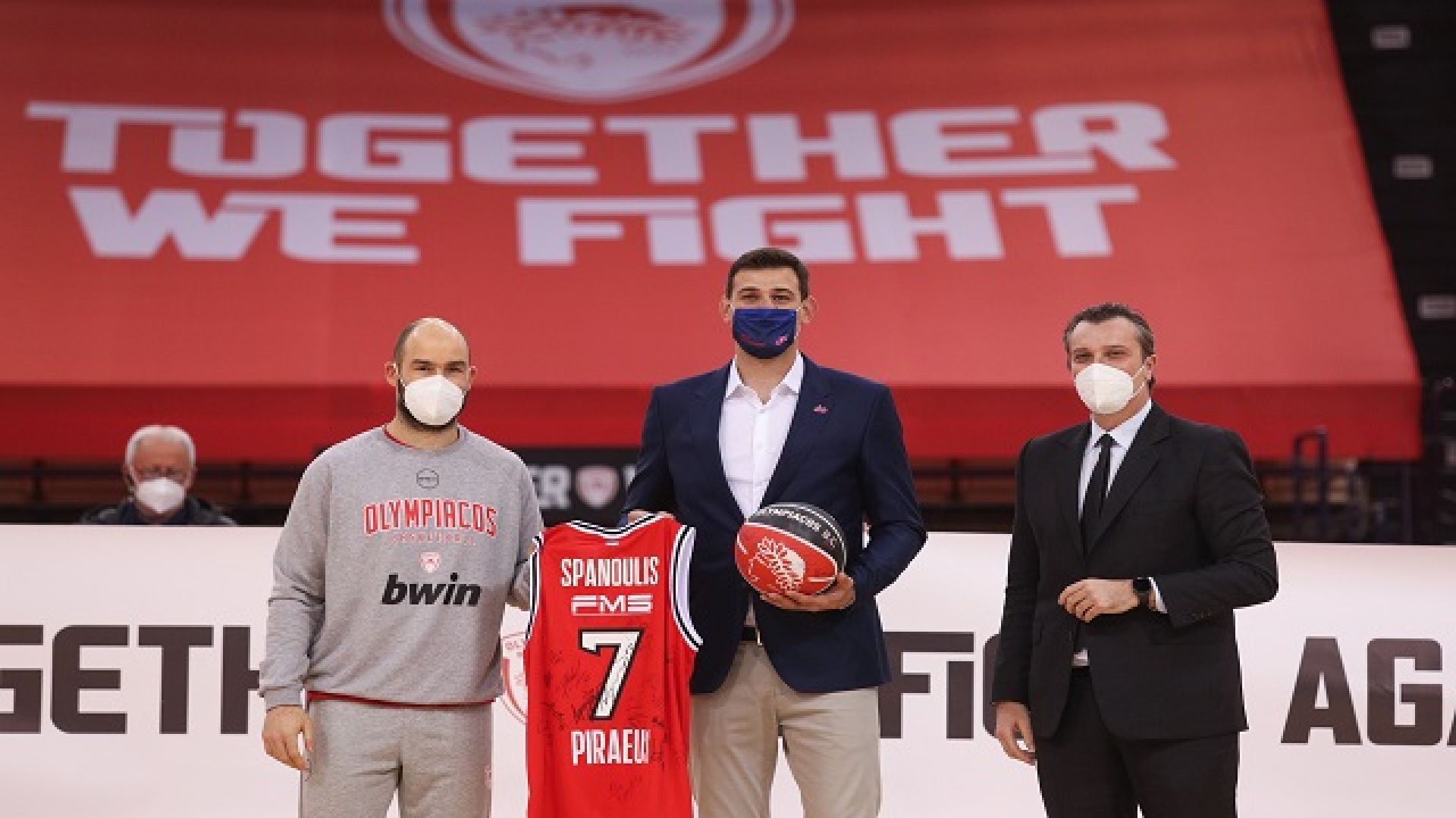Ο τζένεραλ μάνατζερ της Μέγκα, Γκόραν Τσάκιτς πρόσφερε στους Προέδρους του Ολυμπιακού, Παναγιώτη και Γιώργο Αγγελόπουλο από μία συλλεκτική φανέλα της ομάδας του με το ονόμά τους.