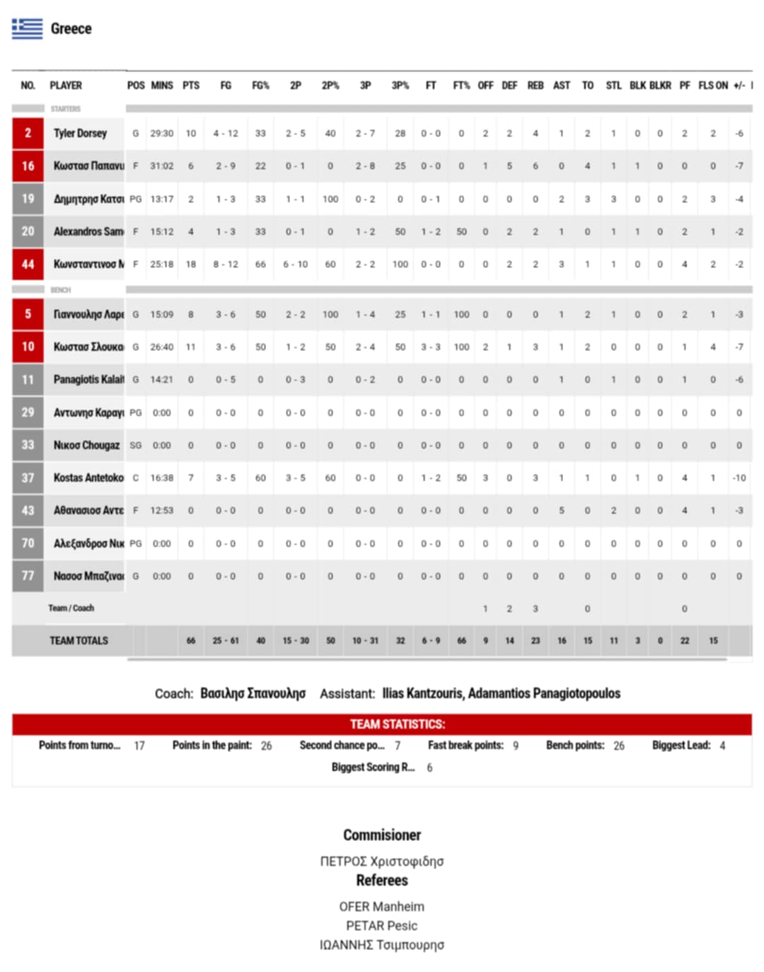 Από την Σερβία διακρίθηκε ο Γιόκιτς με double double με 23 πόντους και με 19 ριμπάουντ, ενώ οι Γιόβιτς και Μπογκντάνοβιτς έβαλαν από 9 πόντους έκαστος. Από την Ελλάδα ξεχώρισαν οι Μήτογλου, Σλούκας και Ντόρσεϊ με 18, 11 και 10 πόντους αντίστοιχα.