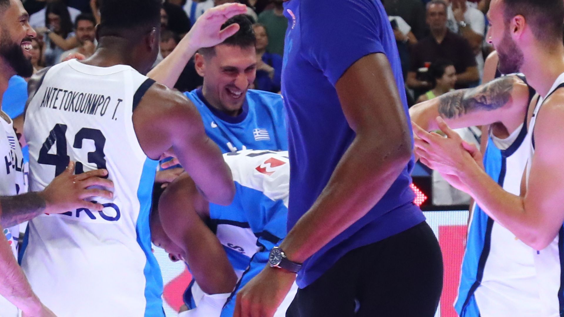 Οι Έλληνες διεθνείς έβαλαν στο κέντρο του γηπέδου τον Greek Freak και τον αποθέωσαν με φατούρο, ειδικά ο Γιαννούλης Λαρεντζάκης, με μια κίνηση που δείχνει ότι το ομαδικό πνεύμα δεν έχει χαθεί από την γαλανόλευκη.