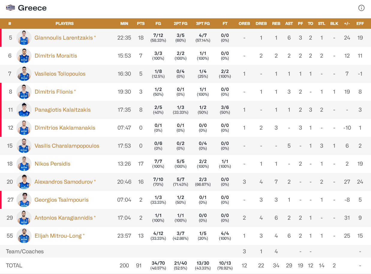 Η μεγαλύτερη διαφορά: +34 για την Ελλάδα (91-57) στο 36’