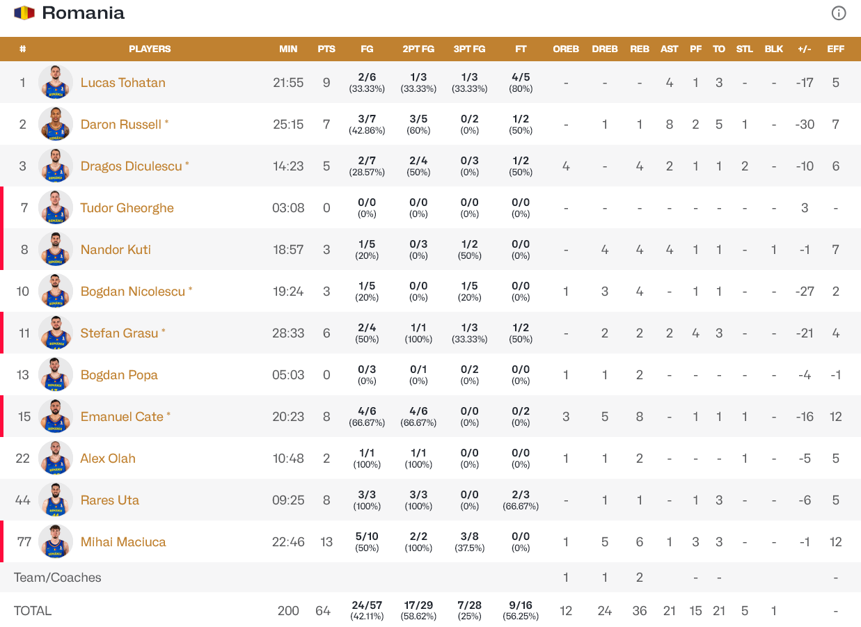 Ξεχώρισαν: Σταθερή αξία ο Λαρεντζάκης με 18 πόντους και έξι ασίστ, με τον Σαμοντούροβ να έχει 16 πόντους και επτά ριμπάουντ, ενώ ο Ελάιζα Μήτρου Λονγκ είχε 13 πόντους, τέσσερα ριμπάουντ και έξι ασίστ. Για την Ρουμανία, ο Ματσιούκα είχε 13 πόντους και έξι ριμπάουντ.