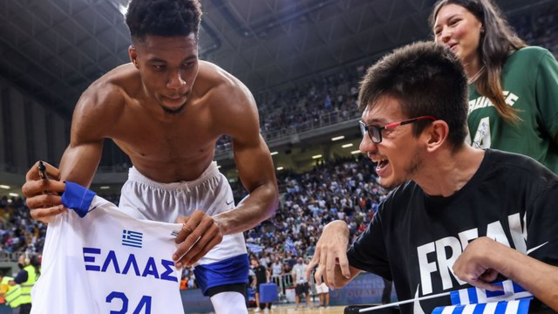 Όταν ο άνθρωπος που είναι καθηλωμένος σε αναπηρικό αμαξίδιο προσέγγισε τον Αντετοκούνμπο εκείνος δεν αρνήθηκε να δώσει τη φανέλα του, την οποία μάλιστα και υπέγραψε προκειμένου ο φίλος της Εθνικής Ελλάδας να έχει ένα όμορφο ενθύμιο.