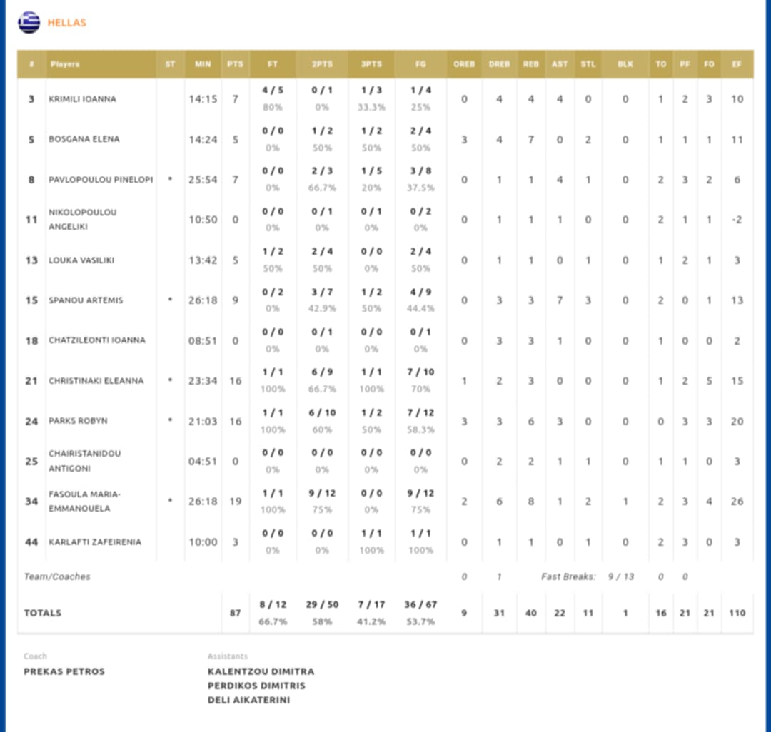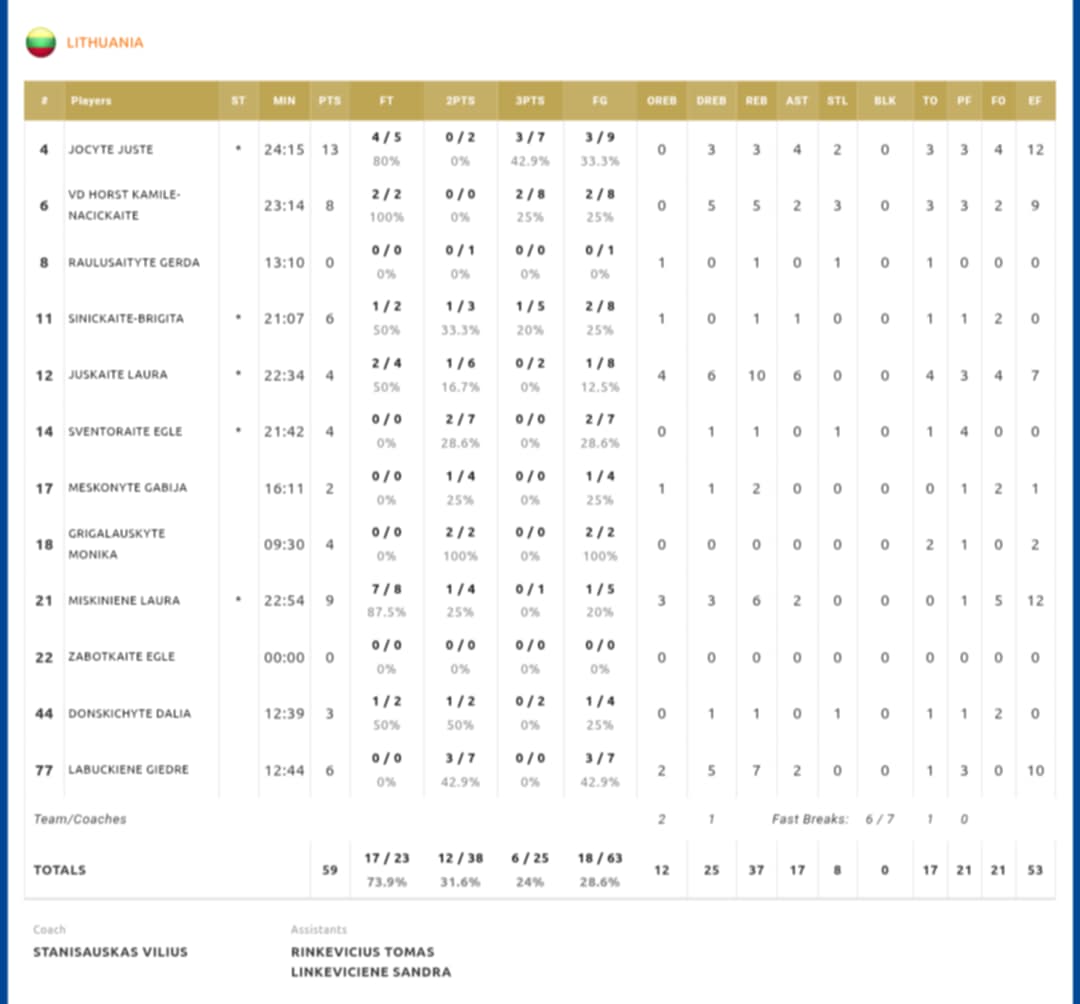 Ξεχώρισαν: Από την Ελλάδα σκόραραν η Χριστινάκη και Πάρκς με 16 πόντους έκαστος. Από την Λιθουανία ξεχώρισαν η Γιόκιτε και η Μισκινιένε με 13 και 9 πόντους αντίστοιχα.