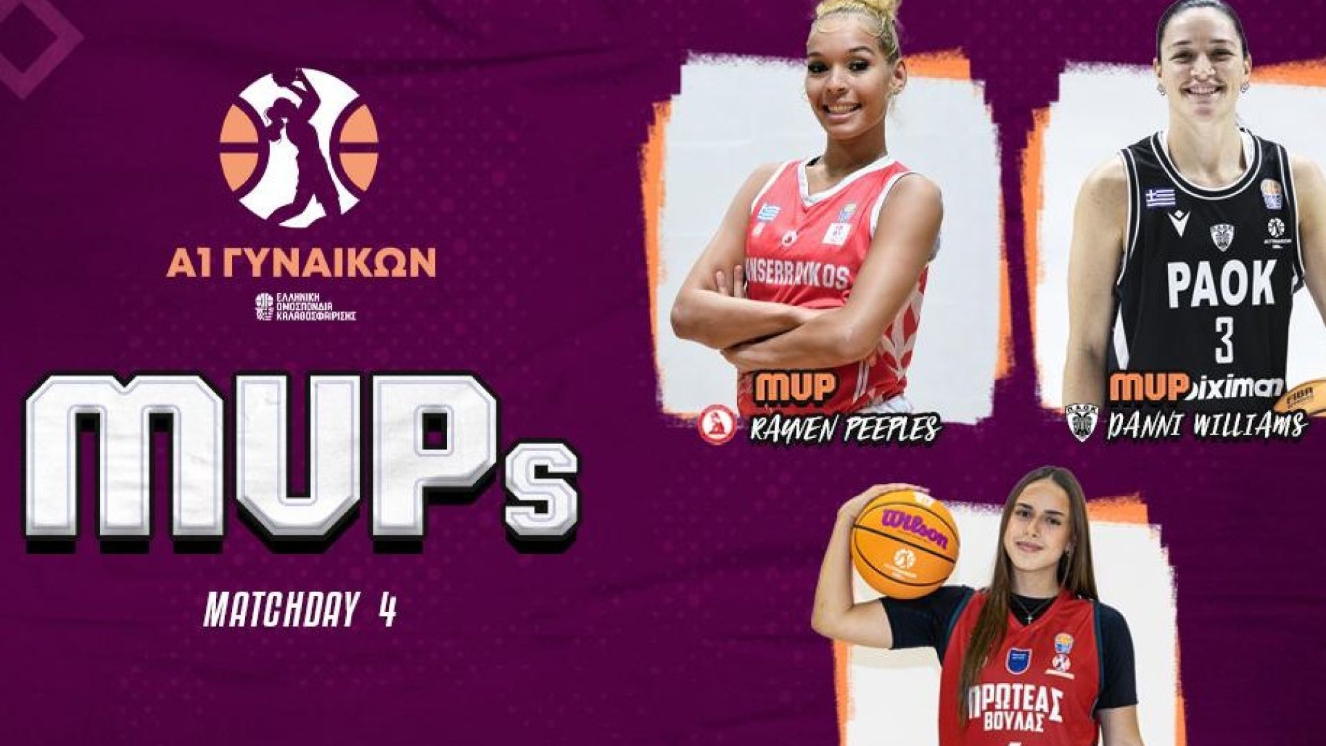 Η 4η αγωνιστική της Α1 Γυναικών πρόσφερε σπουδαία παιχνίδια με το ενδιαφέρον να είναι μεγάλο. Κορυφαίες αυτής της αγωνιστικής ήταν οι Ντάνι Γουίλιαμς του ΠΑΟΚ και η Μίγια Πιπλς του Πανσερραϊκού που μοιράζονται τον τίτλο της MVP, ενώ η Νάγια Στολίγκα του Πρωτέα Βούλας για δεύτερη συνεχόμενη αγωνιστική αναδείχθηκε MVP Next Gen.Η Ντάνι Γουίλιαμς στην επικράτηση του ΠΑΟΚ με 86-82 επί του Πρωτέα Βούλας είχε 22 πόντους, 10 ριμπάουντ, 4 κλεψίματα και 26 στο σύστημα αξιολόγησης μετά από 38’39’’συμμετοχής.