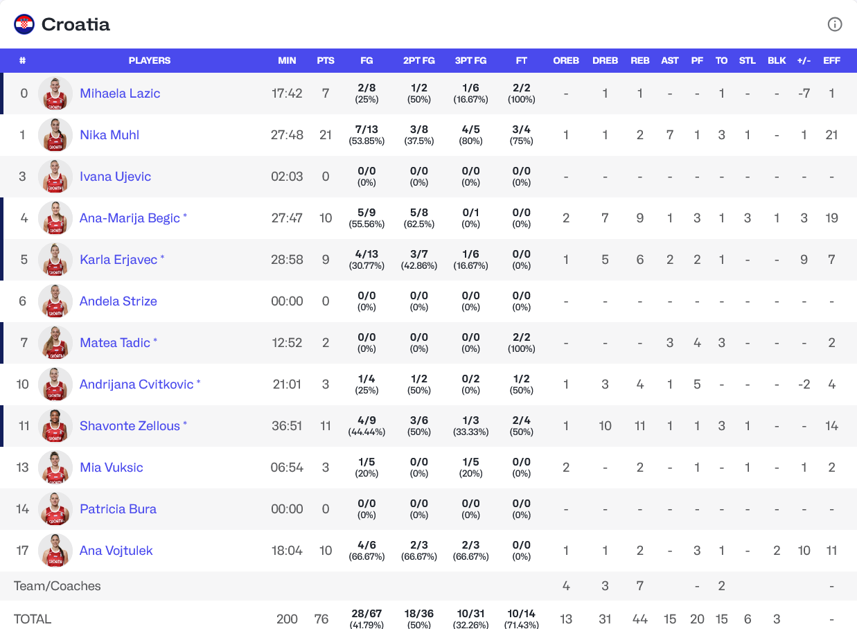 Για την Κροατία, η Μιουλ είχε 21 πόντους και επτά ασίστ, με την Ζέλους να κάνει double – double με 11 πόντους και ισάριθμα ριμπάουντ.