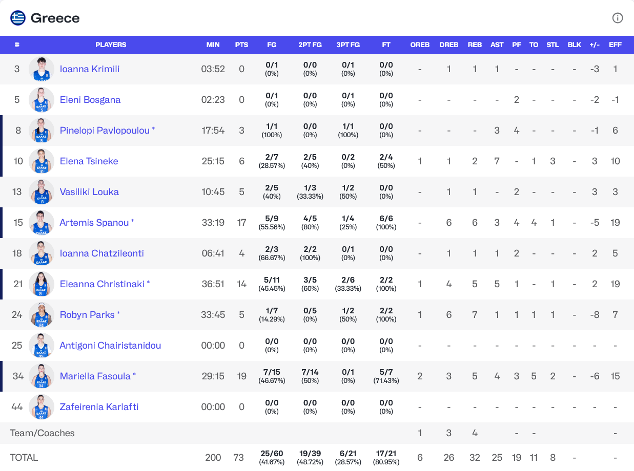 Φασούλα, με 19 πόντους και Σπανού, με 17 πόντους και έξι ριμπάουντ, ήταν οι κορυφαίες της Ελλάδας, που είχε και την Χριστινάκη με 14 πόντους, πέντε ριμπάουντ και ισάριθμες ασίστ.