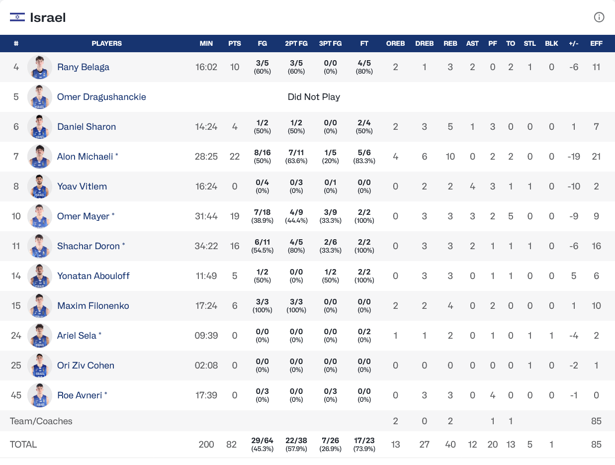 Από την Ελλάδα διακρίθηκε ο Σαμοντούροβ με 25 πόντους, με τους Αβδάλα και Λιοτόπουλο να βάζουν από 14 πόντους έκαστος και τον δε΄΄ύτερο να κάνει triple double με 10 ριμπάουντ και 14 ασίστ. Από το Ισραήλ ξεχώρισαν οι Μικαέλι και Μέιερ με 22 και 19 πόντους αντίστοιχα.