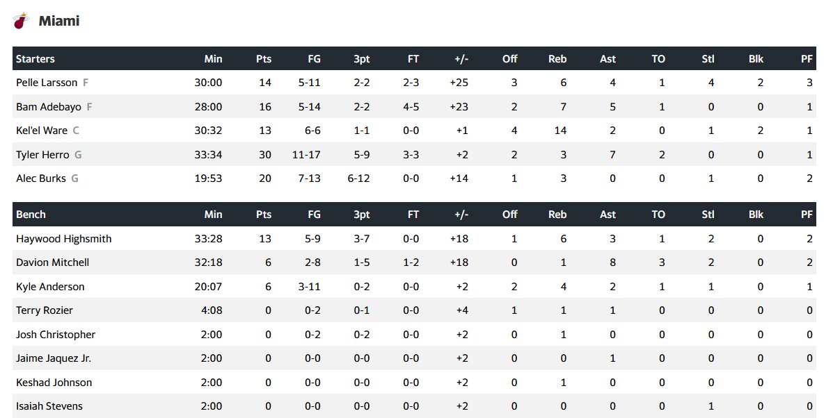 Πρωταγωνιστής του Μαϊάμι ήταν ο Τάιλερ Χίροου που πέτυχε 30 πόντους και 7 ασίστ, ενώ ακολουθεί ο Άλεκ Μπαρκς με 20 πόντους.