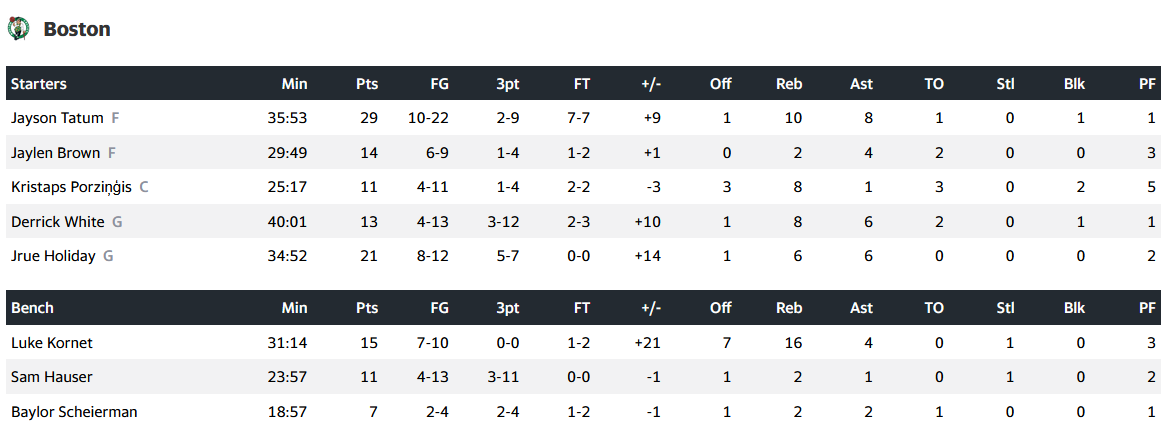 Πολύ καλή επίδοση, από την ομάδα της Βοστώνης σημείωσε ο Τζέισον Τέιτουμ με 29 πόντους, 10 ριμπάουντ και 8 ασίστ, ενώ ακολουθεί ο Τζρου Χόλιντεϊ με 21 πόντους και από 6 ασίστ και ριμπάουντ.