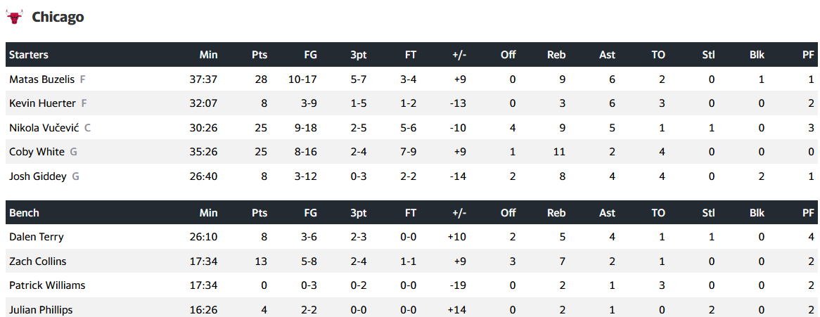 Πολύ καλή επίδοση από το Σικάγο πραγματοποίησε ο Μάτας Μπουζέλις με 28 πόντους, 9 ριμπάουντ και 6 ασίστ, καθώς και ο Κόντι Γουάιτ με 25 πόντους και 11 ριμπάουντ.