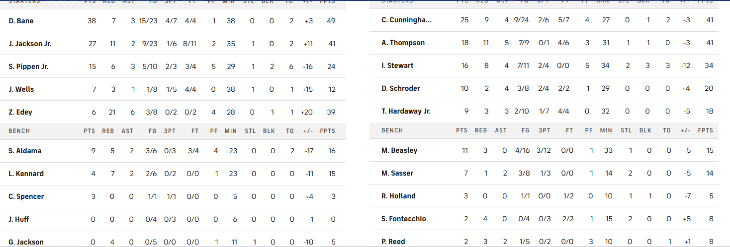 Σπουδαίο διπλό για το Μέμφις, το οποίο έμεινε όρθιο στο Ντιτρόιτ και κατάφερε να φύγει με τη νίκη, κυρίως χάρη στον εξαιρετικό Ντέσμοντ Μπέιν και τους 38 πόντους του, με τον Τζάρεν Τζάκσον να προσθέτει 27 πόντους και 11 ριμπάουντ. Από πλευράς γηπεδούχων, αυτός που ξεχώρισε ήταν ο Κέιντ Κάνινγχαμ με 25 πόντους, 9 ριμπάουντ και 4 ασίστ.