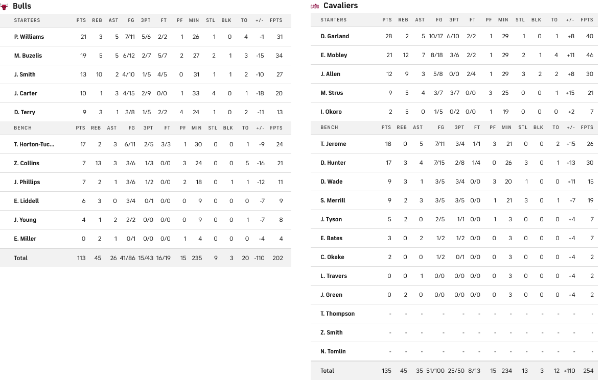28 πόντοι ήταν ο απολογισμός του Ντάριους Γκάρλαντ, με τον Μόμπλι να έχει 21 πόντους και 11 ριμπάουντ, ενώ για το Σικάγο, ο Γουίλιαμς είχε 21 πόντους και ο Μπουζέλις 19.