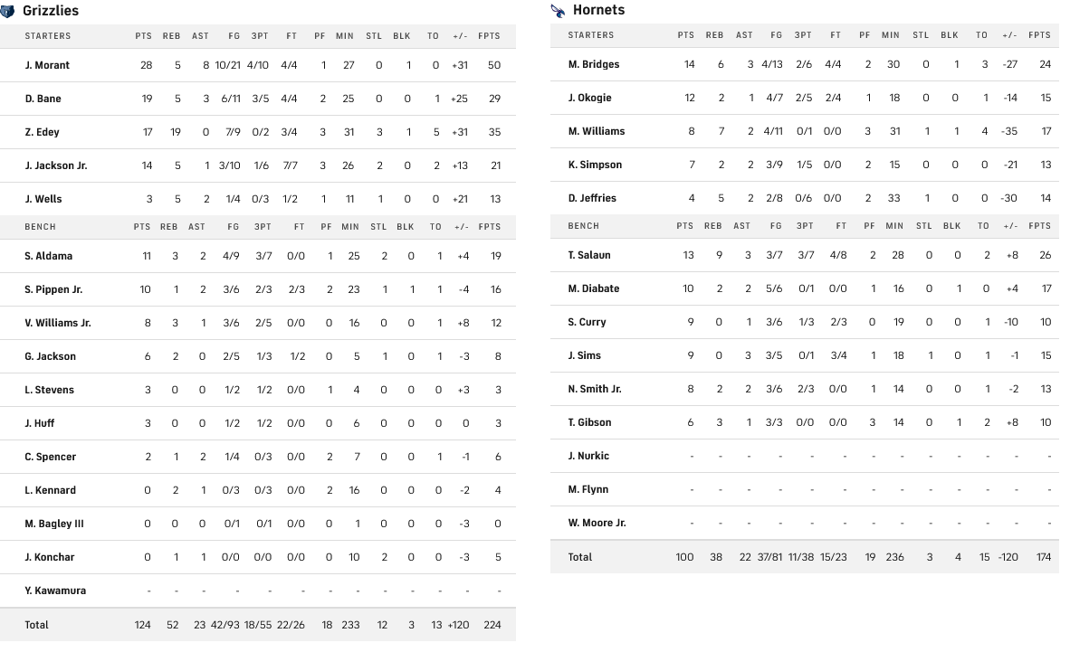 Εύκολο έργο για τους Γκρίζλις, που πέρασαν με 124-100 από την Σάρλοτ, απέναντι στους Χόρνετς, σε ένα παιχνίδι που σημαδεύτηκε από την τρομακτική πτώση του Γουέλς με το κεφάλι στο παρκέ, με τον νεαρό φόργουορντ να την.,.. γλιτώνει με κάταγμα στον καρπό.