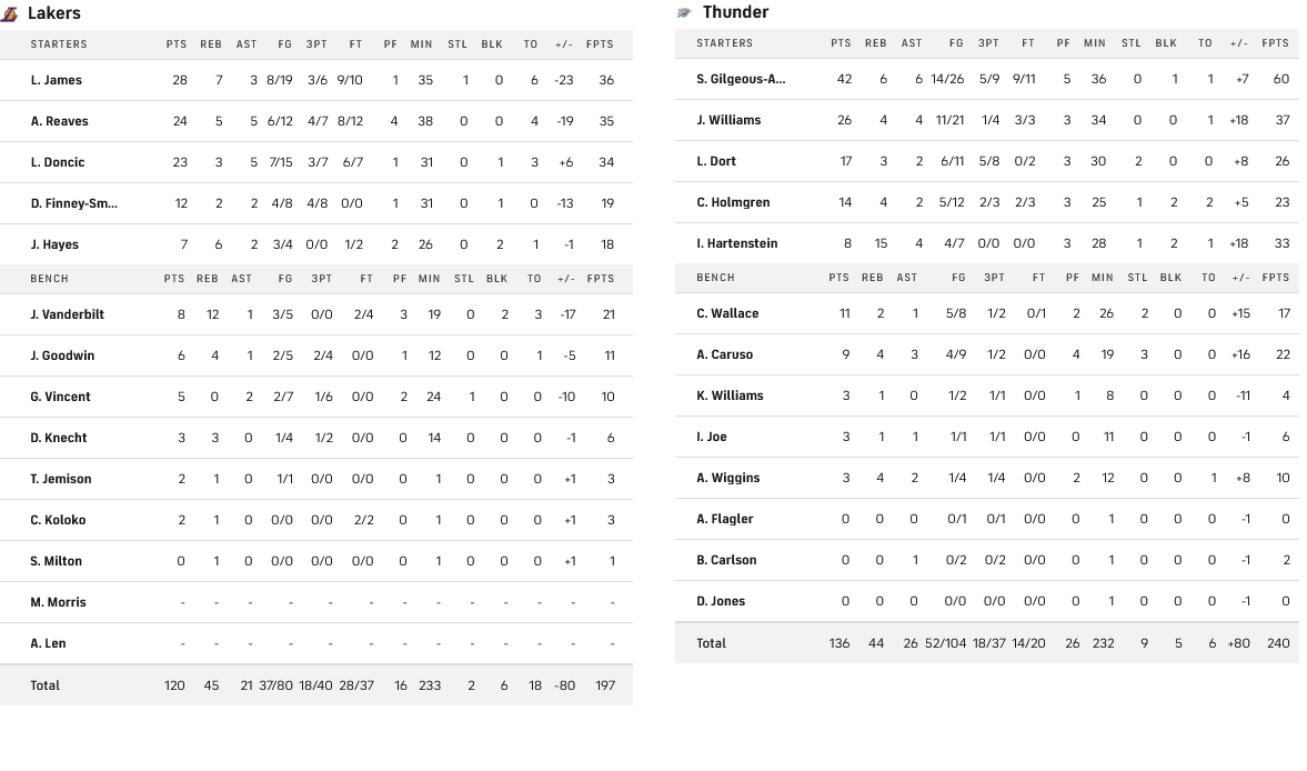 Ασταμάτητος ο Σάι Γκίλτζιους Αλεξάντερ με 42 πόντους, με τον Γουίλιαμς να ακολουθεί με 26 και τον Ντορτ με 17. Για το Λος Άντζελες, ο Λεμπρόν σταμάτησε στους 28 πόντους, ο Ριβς είχε 24 και ο Ντόντσιτς 23, μέχρι την στιγμή της αποβολής του.