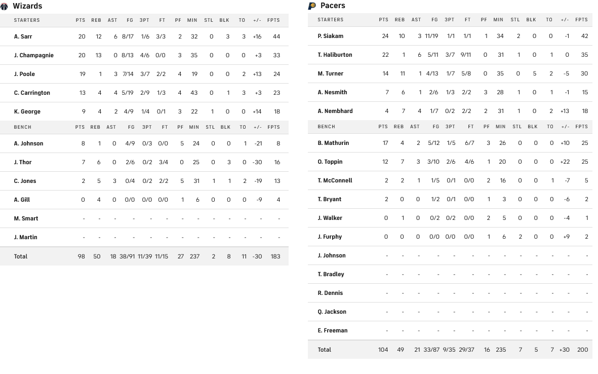 Νίκη με ανατροπή για τους Πέισερς, που επέστρεψαν από το -16 απέναντι στους Γουίζαρντς, φτάνοντας στην νίκη με 104-98. Εξαιρετικός ο Σιάκαμ με 24 πόντους και 10 ριμπάουντ, με τον Χαλιμπάρτον να έχει 22 πόντους και τον Μάθουριν 17, ενώ double – double έκανε ο Τέρνερ, με 14 πόντους και 11 ριμπάουντ.