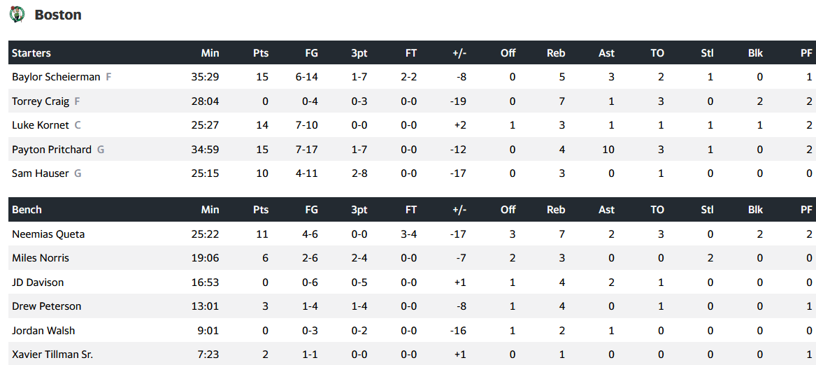Από την ομάδα της Βοστώνης ξεχώρισε ο Μπέιλορ Σίρμαν με 15 πόντους και 5 ριμπάουντ, καθώς και ο Πέιτον Πίτσαρντ με επίσης 15 πόντους και 10 ασίστ.