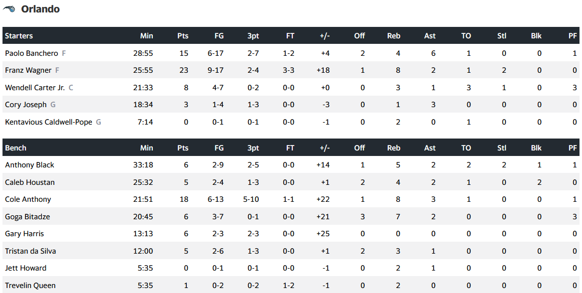 Από τους νικητές, πρώτος σκόρερ και πρωταγωνιστής ήταν ο Φραντζ Γουάνγκερ με 23 πόντους και 8 ριμπάουντ, ενώ ακολουθεί οΚόουλ Άντονι με 18 πόντους και 8 ριμπάουντ.