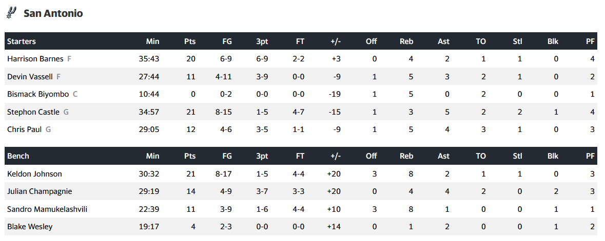 Από το Σαν Αντόνιο ξεχώρισε ο Στέφον Καστλ με 21 πόντους και 5 ασίστ, καθώς και ο Κέλντον Τζόνσον με επίσης 21 πόντους και 8 ριμπάουντ.