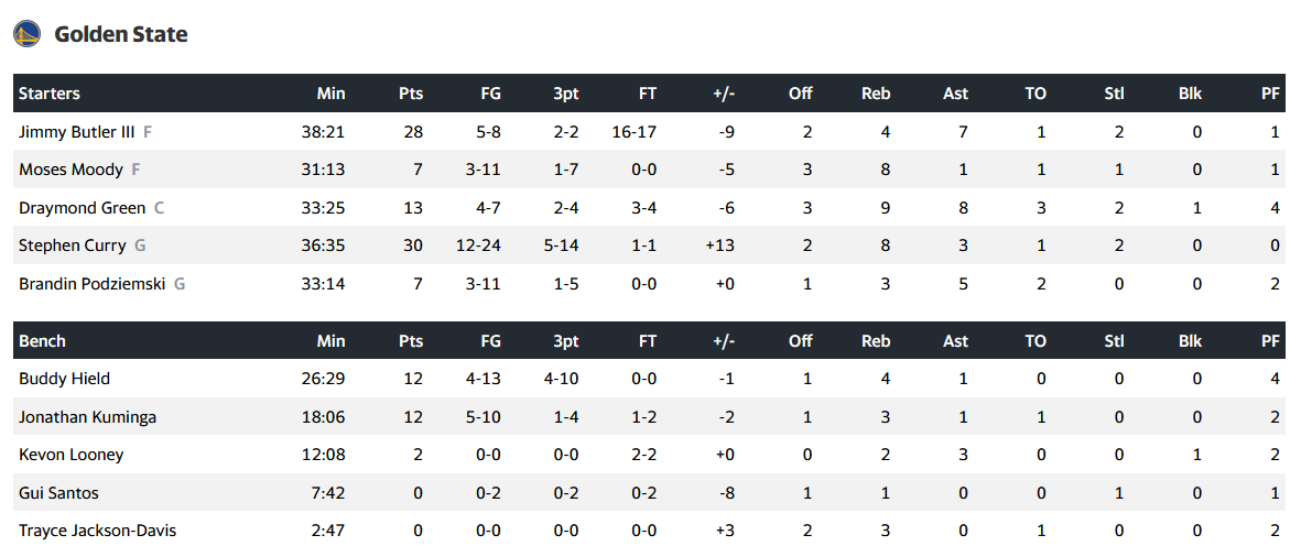 Από την άλλη, από το Γκόλντεν Στέιτ πολύ καλή επίδοση σημείωσε ο Στέφεν Κάρι με 30 πόντους και 8 ριμπάουντ και ο Τζίμι Μπάτλερ με 28 πόντους και 7 ασίστ.