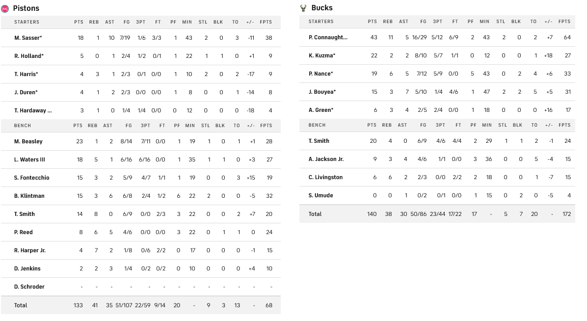 Οι Μπακς αν και αγωνίστηκαν χωρίς τον Γιάννη Αντετοκούνμπο, κατάφεραν να κάμψουν την αντίσταση των σκληροτράχηλων Πίστονς στην παράταση, κλείνοντας με νίκη την regular season.