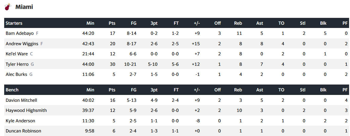 Από τους νικητές, πρωταγωνιστής και πρώτος σκόρερ, ήταν ο Τάιλερ Χίροου με 30 πόντους, 8 ριμπάουντ και 7 ασίστ, ενώ ακολουθεί ο Άντριου Γουίγκινς με 20 πόντους και από 8 ασίστ και ριμπάουντ.