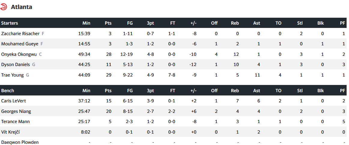 Από την ομάδα της Ατλάντα ξεχώρισε ο Τρέι Γιάνγκ με 29 πόντους και 11 ασίστ, καθώς και ο Ονιέκα Οκόνγκου με 28 πόντους και 12 ριμπάουντ.
