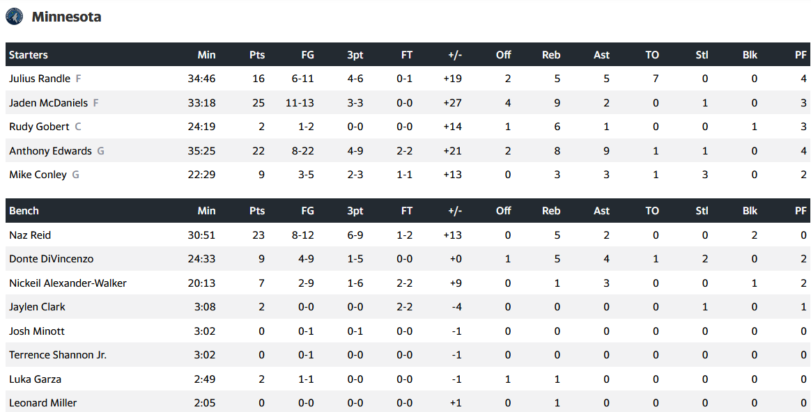 Τα ξημερώματα της Κυριακής (20/4) η ομάδα της Μινεσότα «έσβησε» τους «λιμνανθρώπους» με 95-117 και ξεκίνησε με νίκη στα playoffs του ΝΒΑ.