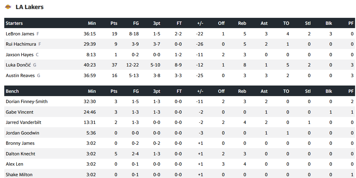 Από την άλλη, από την ομάδα του Λ.Α. πολύ καλή επίδοση σημείωσε ο Λούκα Ντόντσιτς με 37 πόντους και 8 ριμπάουντ, ενώ με διαφορλα ακολουθεί ο Λεμπρόν Τζέιμς με 19 πόντους και 5 ριμπάουντ.