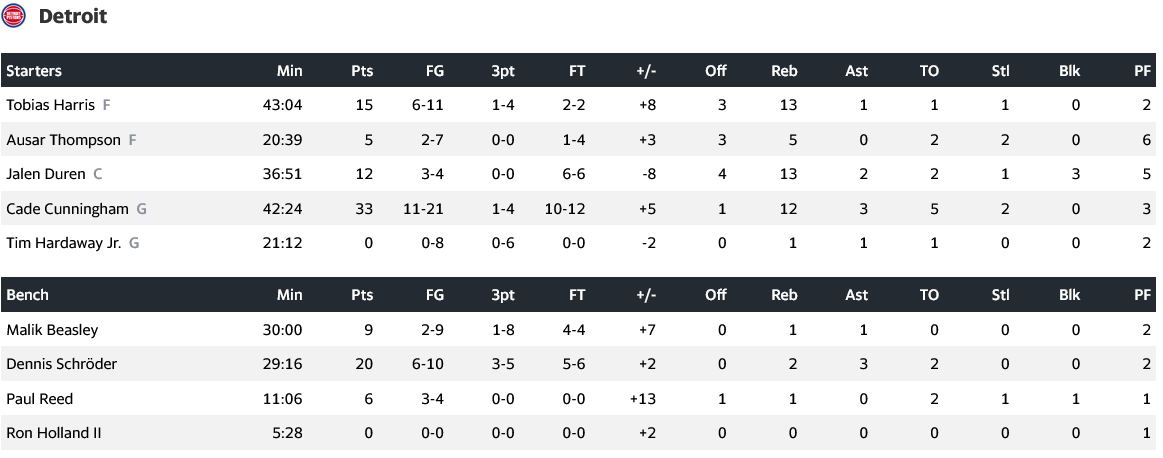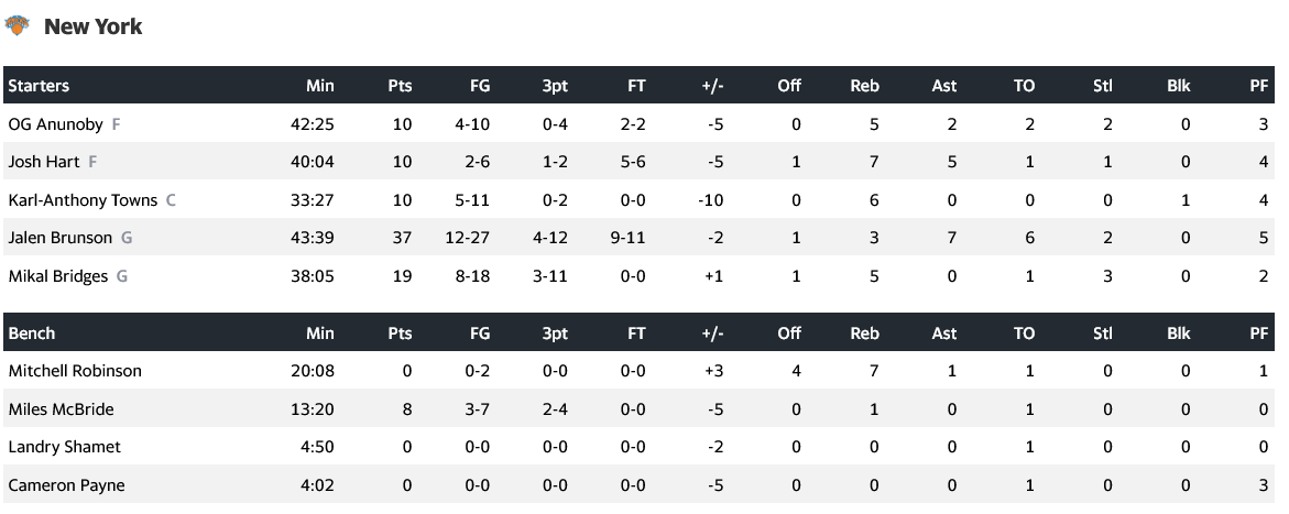 Κορυφαίος για τους νικητές ήταν ο Κέιντ Κάνινγκχαμ, ο οποίος τελείωσε την αναμέτρηση με 33 πόντους, 12 ριμπάουντ και 3 ασίστ, έχοντας για συμπαραστάτες τους Ντένις Σρέντερ (20π, 3ασ) και Τομπάιας Χ΄αρις (15π, 13ρ). Από τους Νεοϋορκέζους, αυτός που ξεχώρισε ήταν ο Τζέιλεν Μπράνσον με 37 πόντους, 7 ασίστ και 3 ριμπάουντ.