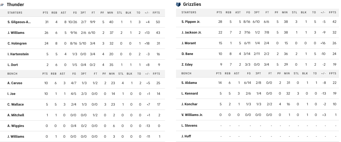 Κορυφαίος για τους νικητές ήταν ο Σέι Γκίλτζεους Αλεξάντερ, ο οποίος τελείωσε την αναμέτρηση με 31 πόντους, 8 ασίστ και 4 ριμπάουντ, έχοντας για συμπαραστάτες του τους Τζέιλεν Γουίλιαμς (26π, 6ρ, 5ασ) και Τσετ Χόλμγκρεν (24π, 8ρ). Από πλευράς γηπεδούχων, ξεχώρισε ο Σκότι Πίπεν με 28 πόντους, 5 ριμπάουντ και 5 ασίστ και θετικός ήταν και ο Τζάρεν Τζάκσον με 22 πόντους και 7 ριμπάουντ.